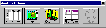 The Analysis Options window allows you to quickly prepare reports, review data, or make charts. Though this window does not stay active during the whole session, all of its options are available from the Applied menu on the Excel menubar.