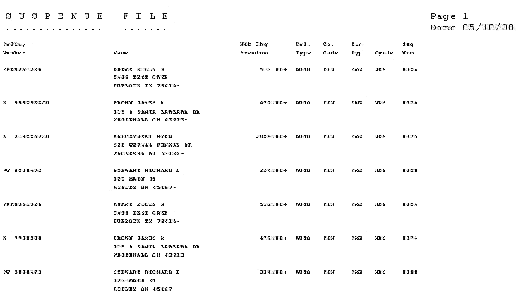 - Print: Click the Print Listing button to select a printer and print a report that lists the policy number, customer name, net change premium, policy type, company code, transaction type, cycle business purpose, and the sequence number of the policies in Suspense. Click Cancel to return the Suspense File screen without printing.