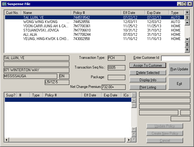 - This is a new Policy, ok? Click Yes to create a new policy. This allows you to enter the desired policy number. Click No to cancel. The customer number displays in the Suspense list next to the Name when assigned.