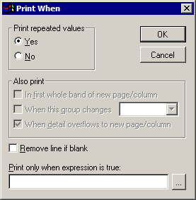 | When This Group Changes | This check box is enabled for a field in a group band. Select this check box and choose a field name from a list to designate the object to print when the chosen field changes. |