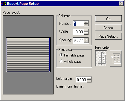 On the Report Designer menubar, click File, Page Setup to display the following dialog box.