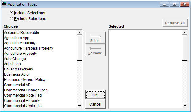 - To remove an item from the Selected list, double click the item or highlight the item and click Remove. You may also click the Remove All button to clear all selections made.