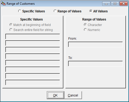Note that you cannot enter specific values and a range of values. For example, if you had data entered in the Specific Values frame and then selected the Range of Values radio button, the Range of Values frame would be enabled and all entries in the Specific Values frame would be cleared.