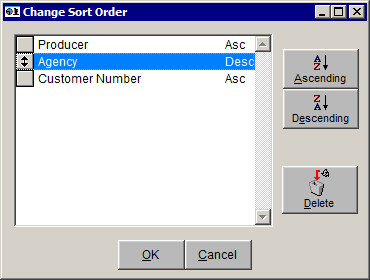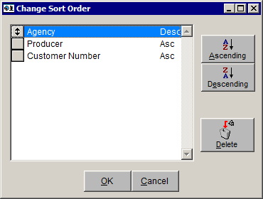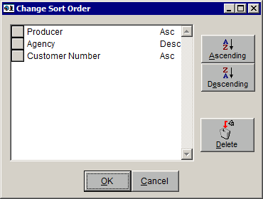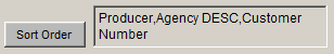 Fields are displayed in the order in which they will sort. Fields arranged in descending order are followed by DESC. Fields arranged in ascending order have no identifier. In the example above, items will first sort by introducer, arranged in alphabetical order by introducer code. Second, the items for each introducer will sort by agency in descending order, e.g., Agency 2, then Agency 1. Finally, the items for each agency will sort by customer number in ascending order.