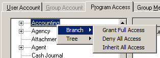 Note:Branch refers to all items included in the currently highlighted area of the treeview. Tree refers to all items listed in the treeview. Inherit means the user will automatically be granted the same access as the group that the user belongs to.