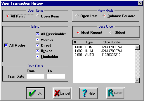 Note: The View Transaction History window is also accessed by double clicking the Filter radio button on the Transaction List screen.